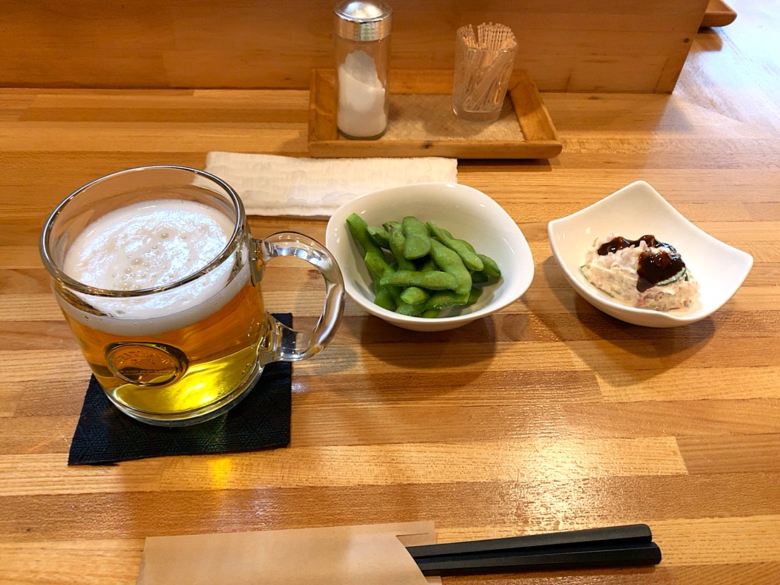 ぷっはああ!夏のビール最高。お通しは枝豆とポテトサラダ。ポテサラにはソースが掛かっていてこれがまた合う。
